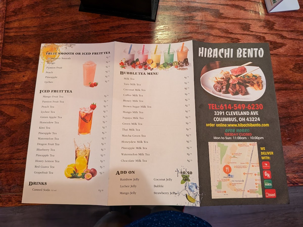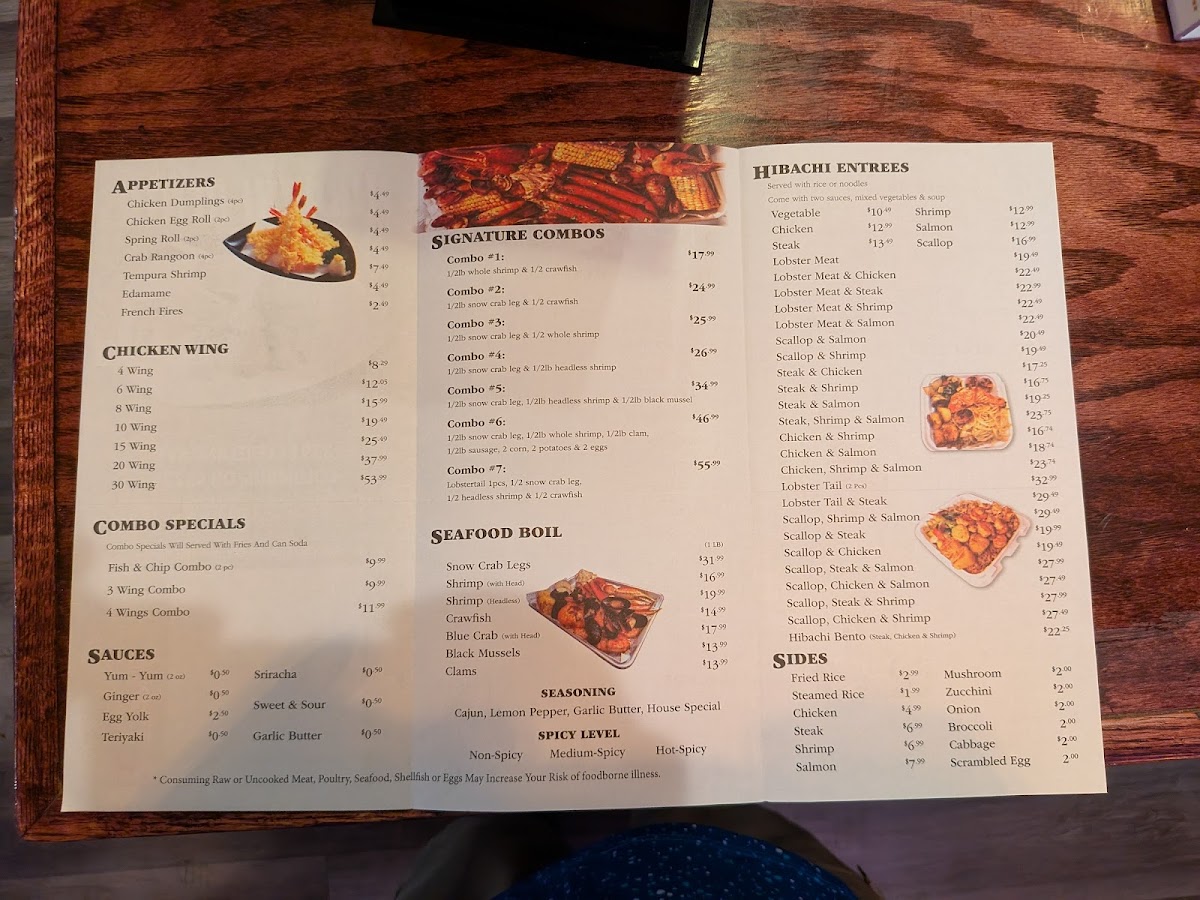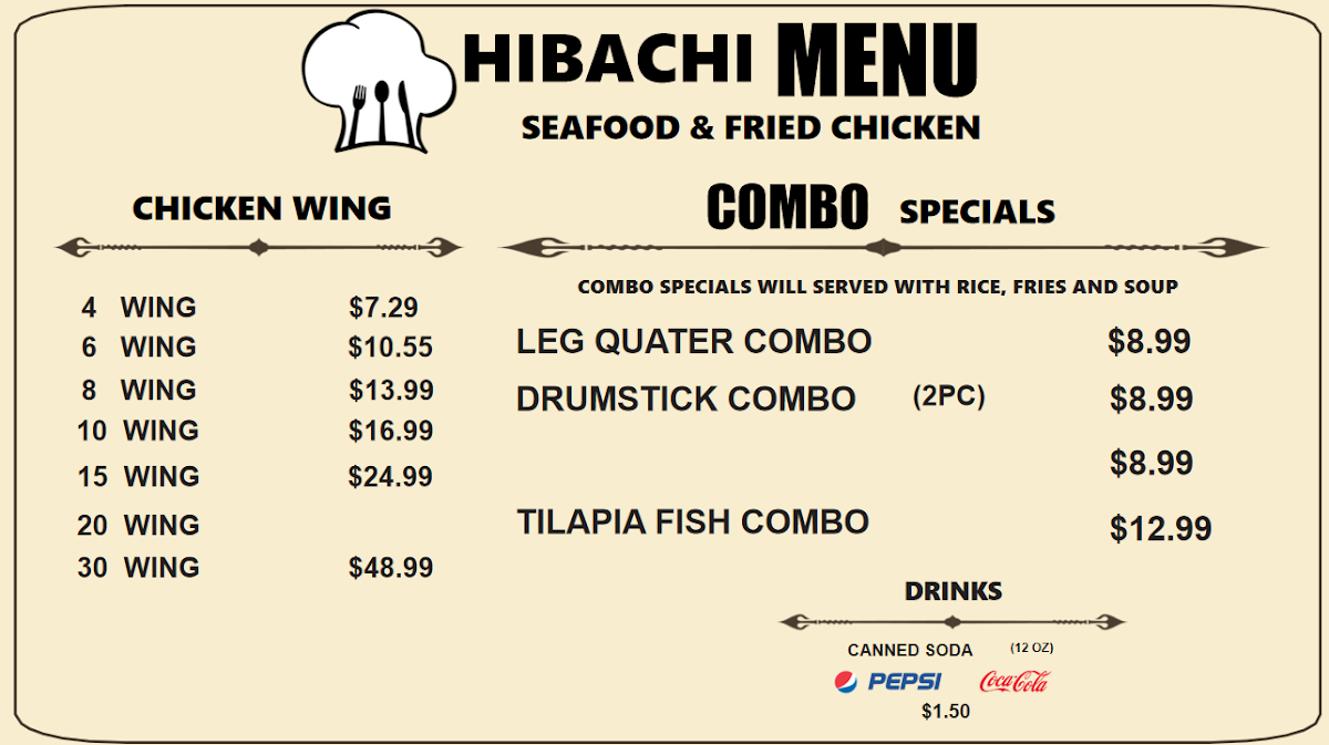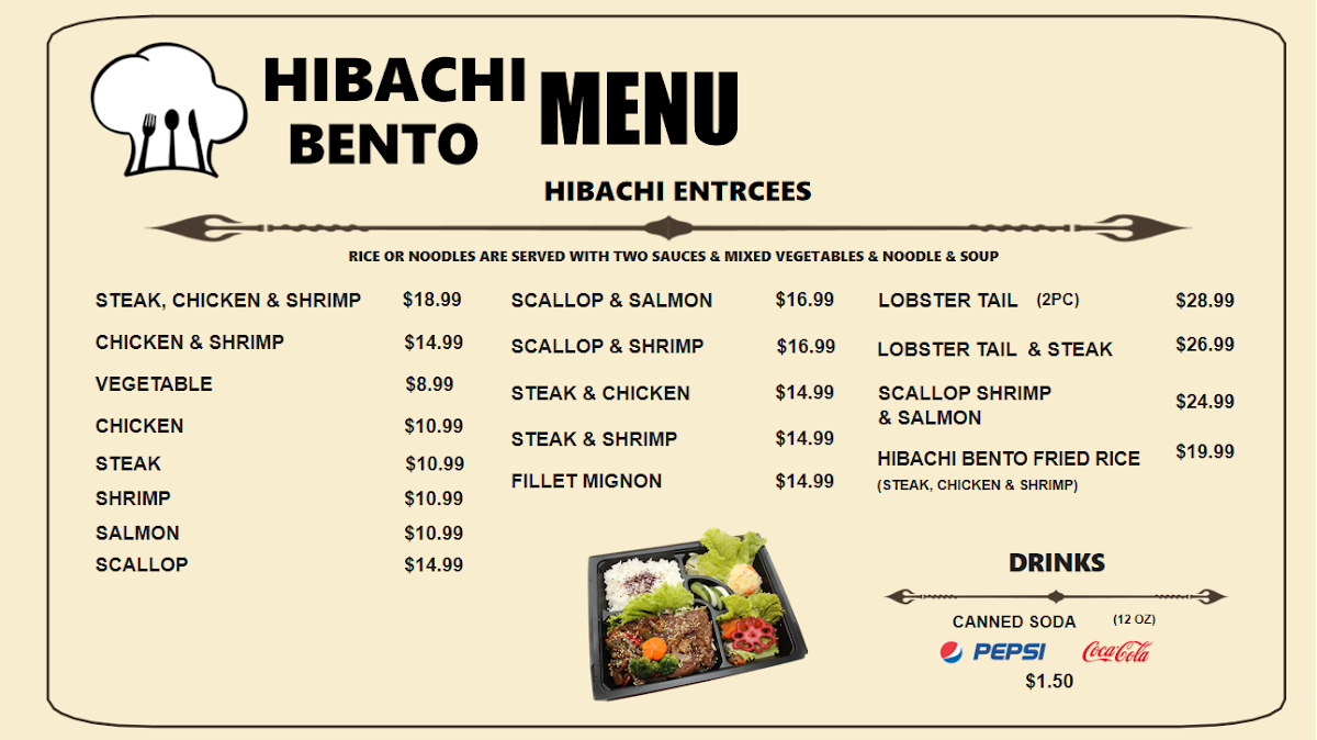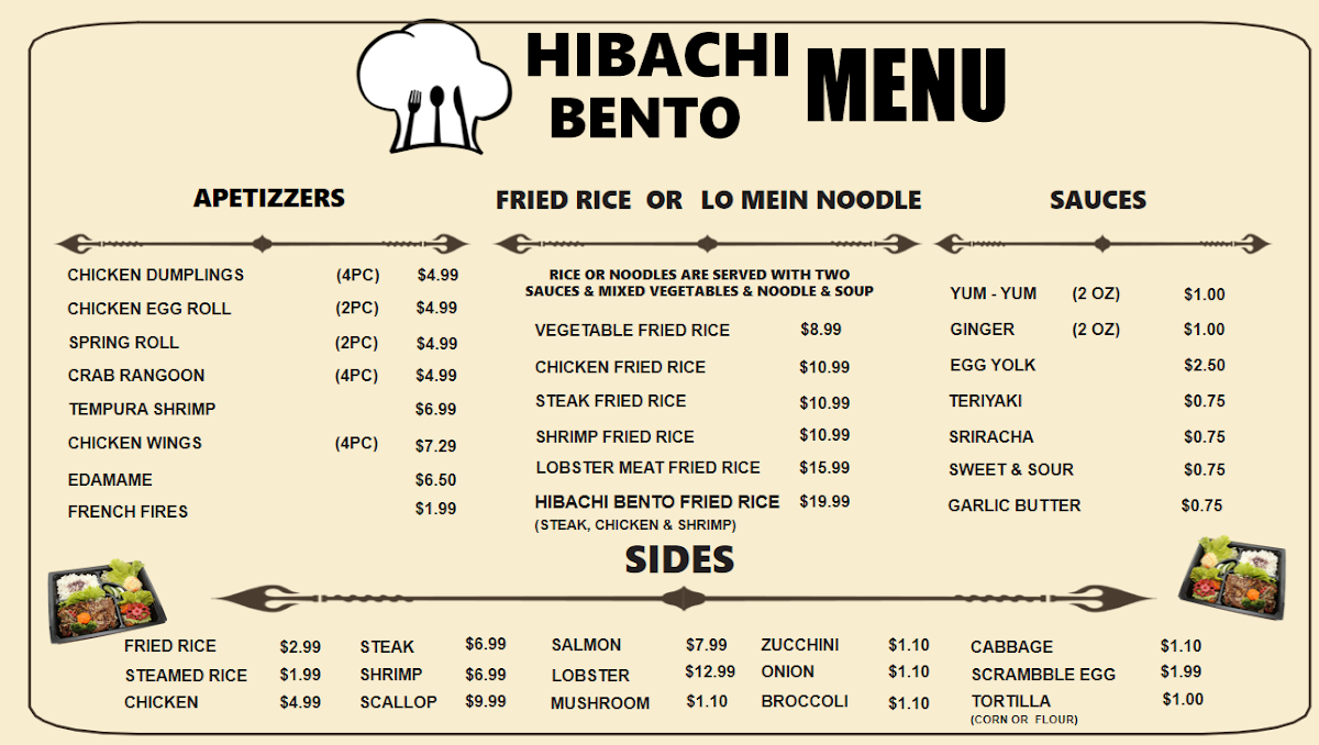 The menu at Hibachi Bento Cleveland Ave offers a diverse selection that caters to various tastes, combining traditional hibachi fare with seafood and appetizers. For sides, customers can opt for EXTRA CHICKEN, EXTRA BROCCOLI, EXTRA STEAMED RICE, EXTRA STEAK, or EXTRA SALMON to complement their meals. The seafood boil combos are a standout, with options like COMBO#4 featuring 1/2LB SNOW CRAB LEG & 1/2LB HEADLESS SHRIMP and COMBO#6, a massive mix of 1/2LB SNOW CRAB LEG, 1/2LB WHOLE SHRIMP, 1/2LB CLAM, 1/2LB SAUSAGE, 2 CORN, 2 POTATOES, and 2 EGGS. Appetizers include favorites such as CHICKEN EGG ROLL (2PC), HIBACHI SOUP, and CRAB RANGOON (4PC). For those craving a hearty rice or noodle dish, the STEAK FRIED RICE, CHICKEN FRIED RICE, and HIBACHI BENTO FRIED RICE (a mix of STEAK, CHICKEN, and SHRIMP) are flavorful choices. The hibachi entrées are a highlight, offering combinations like CHICKEN, HIBACHI BENTO ENTREES, SCALLOP & SHRIMP, and the popular CHICKEN & SHRIMP. To complement the meal, beverages like SODA, SWEET TEA, LEMONADA, and FRUIT PUNCH are available. For an extra kick, customers can choose from a variety of sauces such as SRIRACHA, TERIYAKI, and YUM YUM. Lastly, the CHICKEN WINGS are available in several sizes, from 4 WINGS to 15 WINGS, making it a great option for sharing. Overall, the menu at Hibachi Bento Cleveland Ave provides a satisfying mix of options for both meat lovers and seafood enthusiasts.
